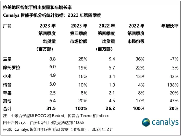 2023年第四季度,拉美地区智能手机市场实现20%的增长。2023年全年,该地区市场增长2%,达到1.189亿台。