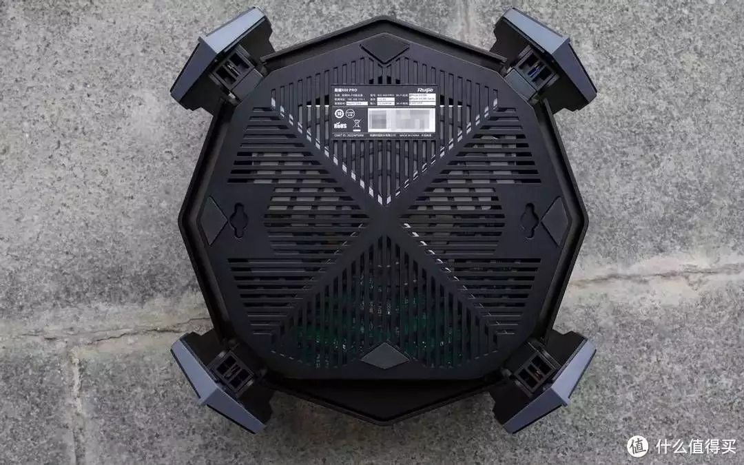 路由器的底部有大量的散热网格,跟表面天蝎脚的纹路通孔形成对流,散热效率不错;此外还能看到路由器有两个挂墙孔,确保了无论是平放还是挂墙,都能良好的散热和稳定性。