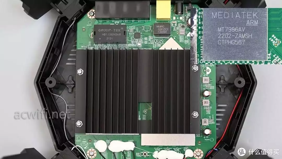 村民买锐捷天蝎电竞X60 Pro路由器之前就在看acwifi过它的用料,路由器有配置硕大的散热片,覆盖了主板的大半部分,CPU用的是发哥的Filogic 830(MT7986A),集成双频Wi-Fi 6的无线基带,5G支持4x4MIMO,最高速率4804Mbps, 2.4G支持4x4MIMO,最高速率1147Mbps,就是我们所说6000M无线路由器的由来。