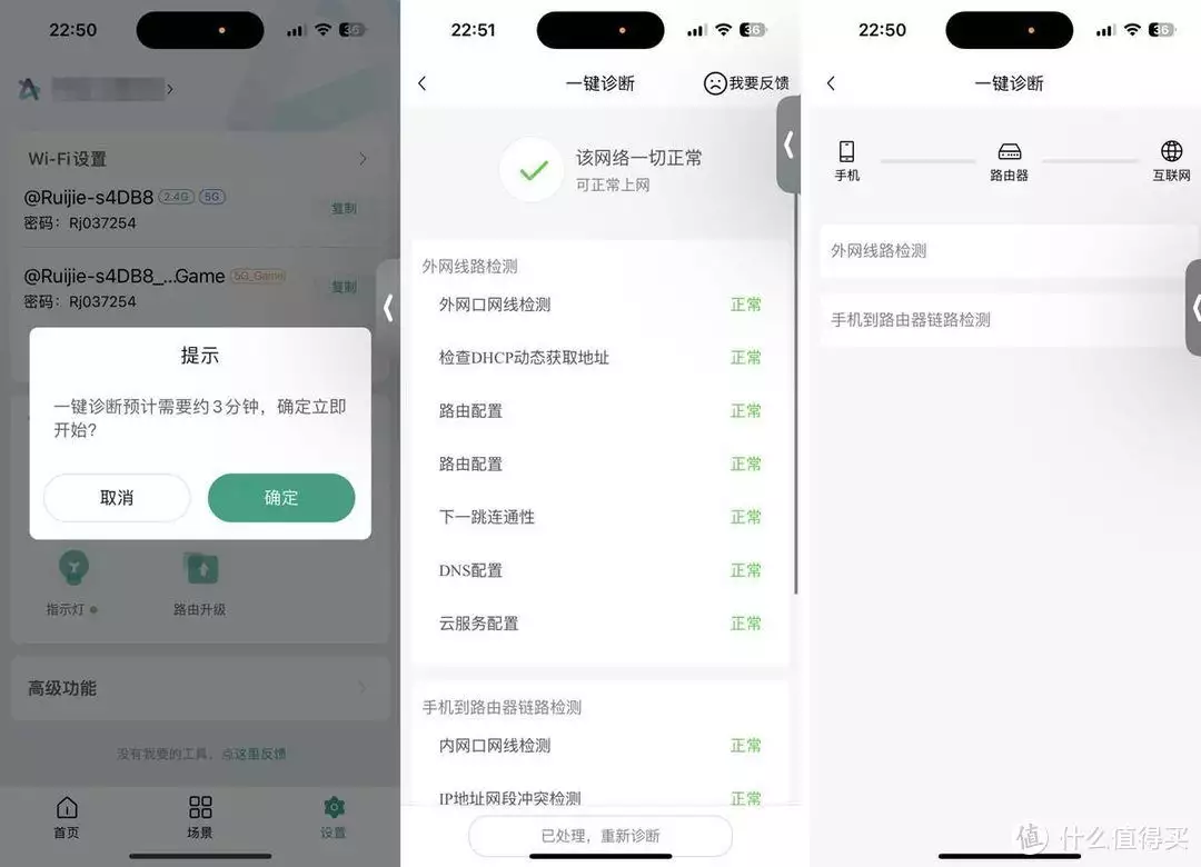 锐捷天蝎X60 PRO还支持一键诊断,小白在组网过程中,如果遇到了某些环节出现了问题,借此功能就能很容易排查出问题,并自动优化修复。