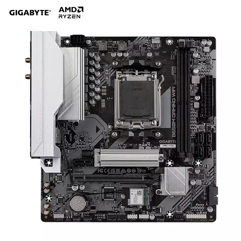 技嘉白魔鹰 B650M GAMING WIFI 主板首先为大家推荐的是这款技嘉白魔鹰 B650M GAMING WIFI 主板(以下简称白魔鹰 B650M),这款主板采用黑色 PCB 板搭配银白色散热装甲的设计,辅以精致的矩阵条纹进行装饰,有电竞机甲的酷炫气质,颜值还是很耐看的。
