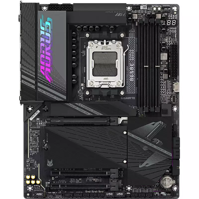 最后再为热爱电竞游戏的玩家们推荐这款技嘉电竞雕 B650E AORUS PRO X USB4 主板(以下简称 B650E 电竞雕 USB4)。这款主板在外观上主打电竞风格,纯黑的 PCB 板和散热装甲,表面还有技嘉 AORUS 品牌标识图案,加上全覆盖的散热装甲带来整洁、模块化的视觉观感,让 B650E 电竞雕 USB4 看起来很是硬核高端。