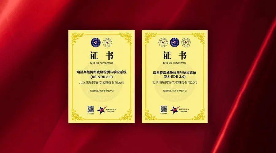 近日, 瑞星终端威胁检测与响应系统(EDR)、 瑞星网络威胁检测与响应系统(NDR)两款产品以优异的成绩通过国际知名第三方检测机构 赛可达实验室评测,并被授予 “东方之星”证书。其中瑞星EDR的 勒索软件和挖矿病毒检测率均达到100%,这标志着瑞星产品在技术实力和产品性能方面达到了世界领先的水平。