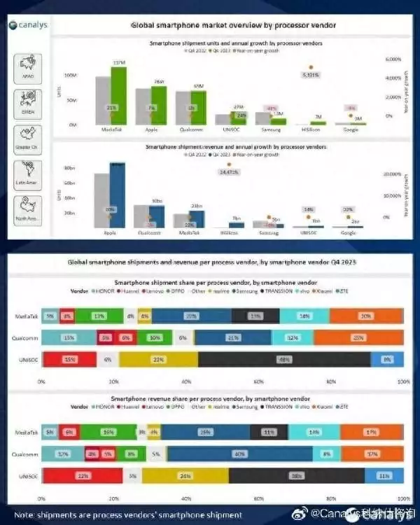 而向上追溯,到供应链端,从今日Canalys公布的2023年Q4智能手机芯片SoC数据来看,厂商们之间的竞争也是异常激烈,联发科在2023年Q4成为全球最大的智能手机SoC厂商,全球智能手机的大部分营收被苹果垄断。目前在智能手机SoC领域,一个苹果、联发科、高通、紫光展锐、海思的五足鼎立格局正在形成。尤其是随着华为智能手机业务的复苏,海思正在以百米冲刺般的速度重新回到这个牌桌。