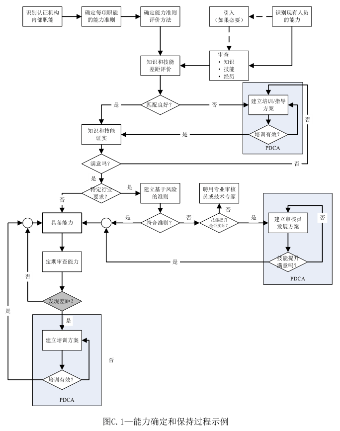 图C.1的流程图显示了一种通过识别要完成的具体任务、识别实现预期结果所需的具体知识和技能来确定人员能力的方式。过程中使用了附录B描述的评价方法。