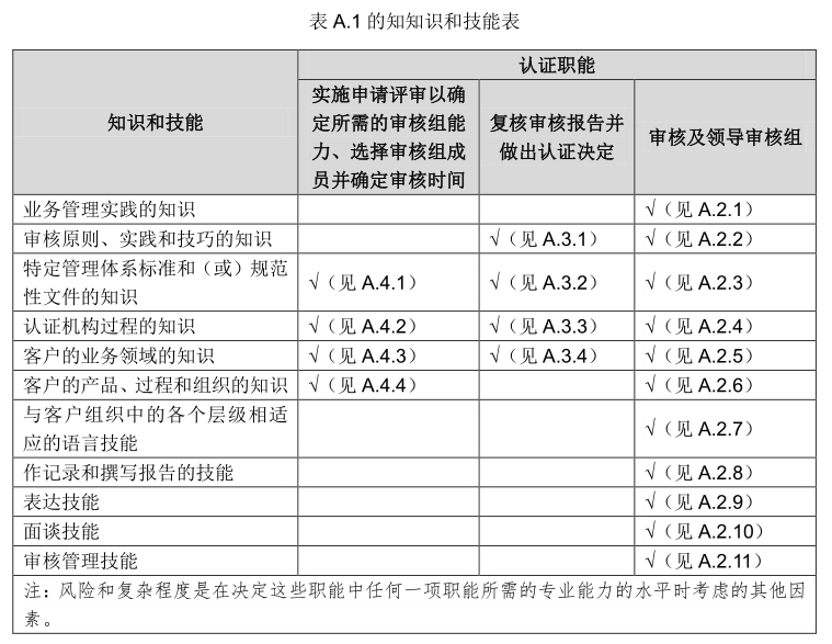 表A.1明确了认证机构应为特定的认证职能确定的知识和技能。“√”指认证机构应确定相应的知识和技能的准则和深度。表A.1中规定的知识和技能在下文中有更详细的解释,表中用扩号注明了相应解释文本的编号。