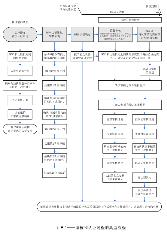 图E.1代表了一个典型的流程。可以实施其他审核活动,例如文件审查和特殊审核。审核周期与认证周期之间的不同参见9.2和9.3。