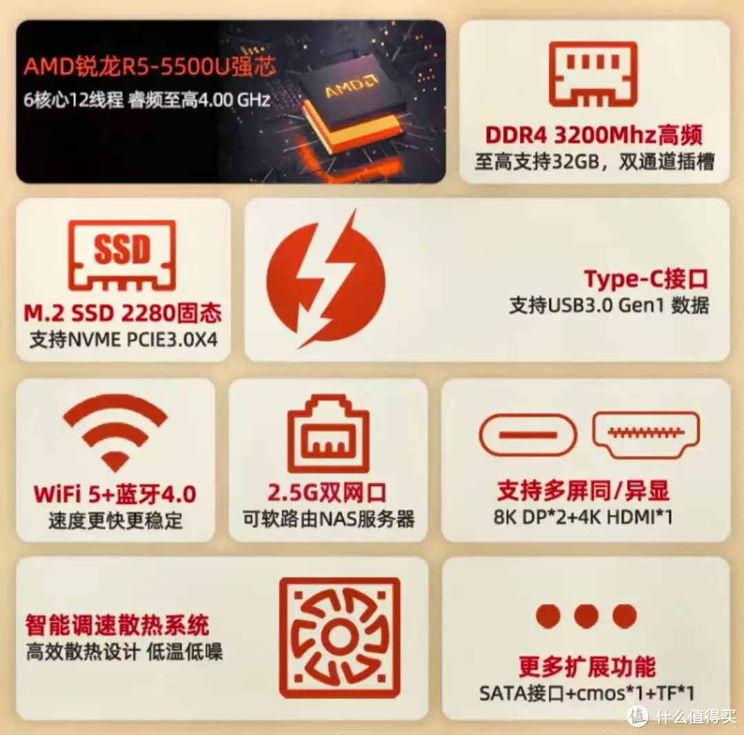 搭载AMD锐龙R5 5500U处理器,拥有双通道DDR4 3200MHz内存插槽;两种硬盘接口,M.2 2280 SSD支持NVME PCIe3.0x4、SATA 3.0支持加装2.5英寸固态/机械硬盘;内部标配无线网卡,支持WiFi5和蓝牙4.0;