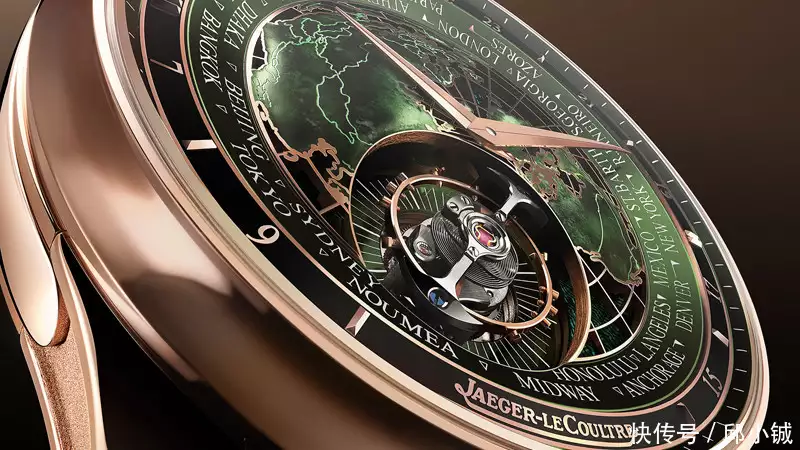 内环则显示24小时,镶有长方体立体时标,配有激光雕刻数字,此外还有积家的字母标识。地图一侧的圆环中,飞行陀飞轮仿若漂浮于海洋之上,每60秒旋转一圈,每24小时在表盘上旋转一周,穹顶形地图和城市环圈则同步旋转,模拟地球自转的景象。圆环上标记于城市名称旁的时间,始终正确指示每个城市的准确时间。