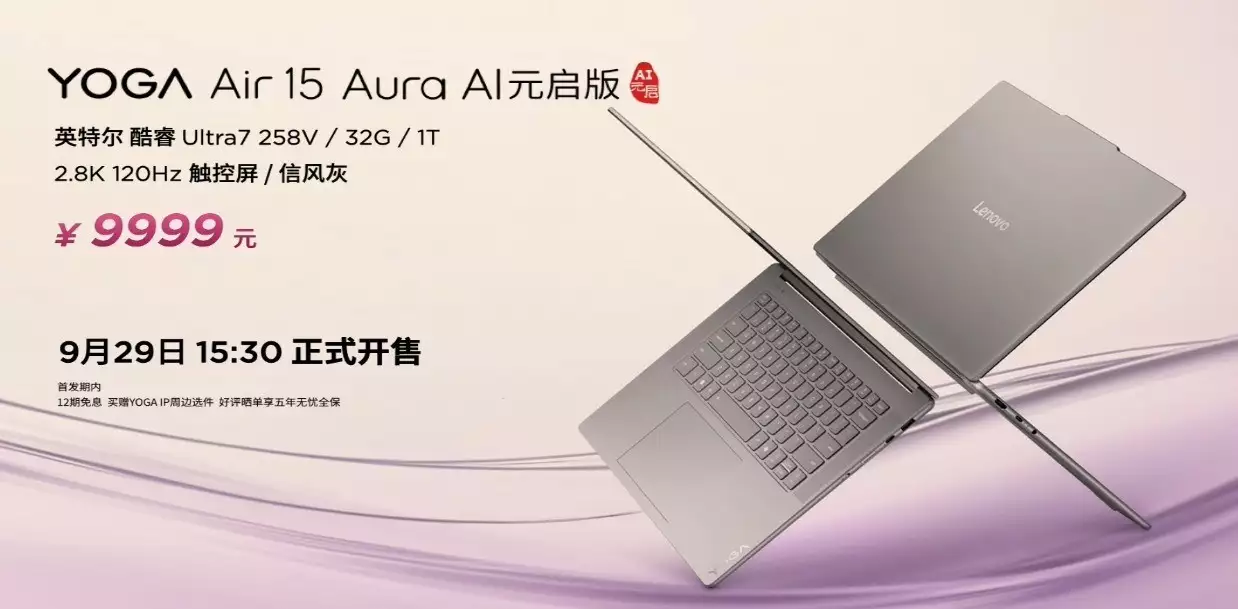 IT之家 9 月 29 日消息,联想 YOGA Air 15 Aura AI 元启版笔记本今日正式发布,定价 9999 元,今日(9 月 29 日)15:30 开售。