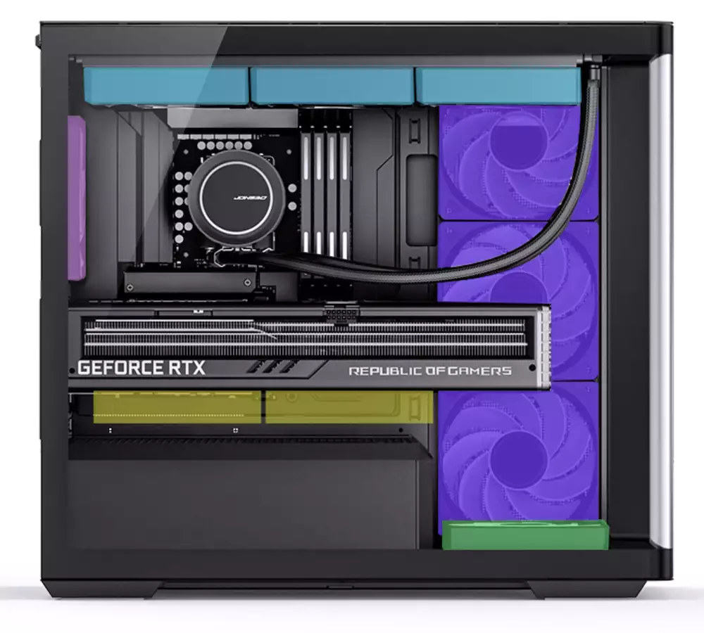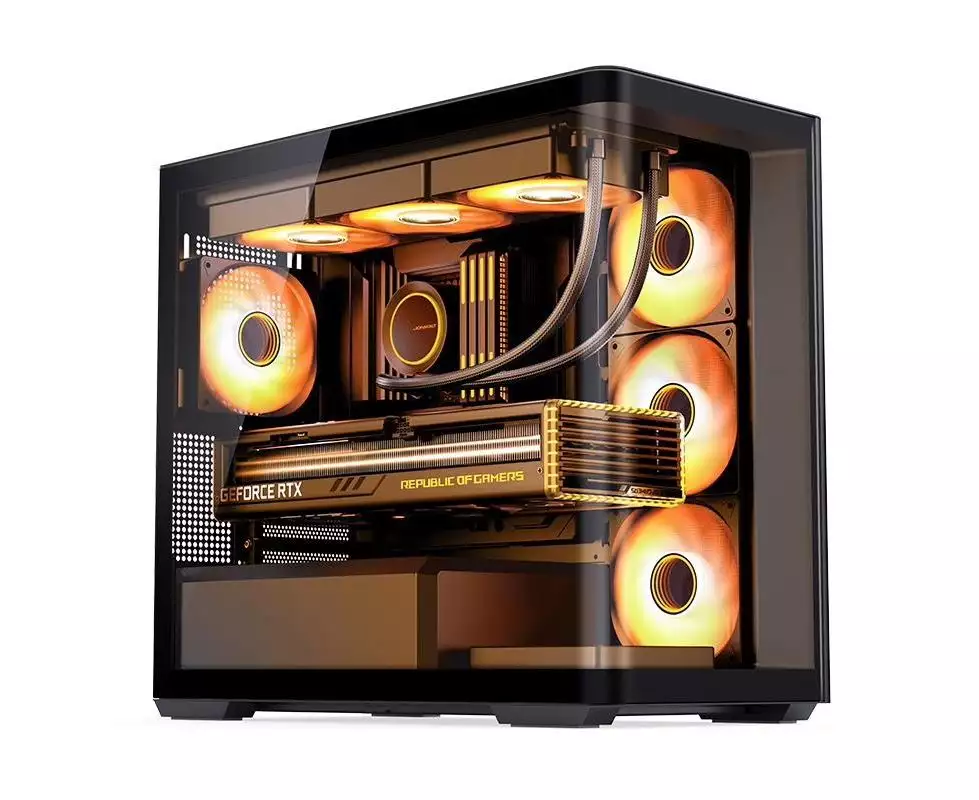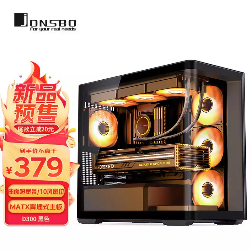 这款机箱尺寸为 236.4mm (W) * 420.9mm (H) * 460.2mm (D)。官方表示,乔思伯 D300 为 D301 姊妹款,运用曲面一体化弯折环视钢化玻璃设计,提供 270 度超宽景展示硬件,R 角过渡自然优雅圆润,顶盖和背线侧采用大面积 MESH 细孔结合 10 组风扇位搭配,多种组合散热方式,兼顾光效和风道,5 位 PCI 槽位设计更加友好支持 40 系显卡安装。