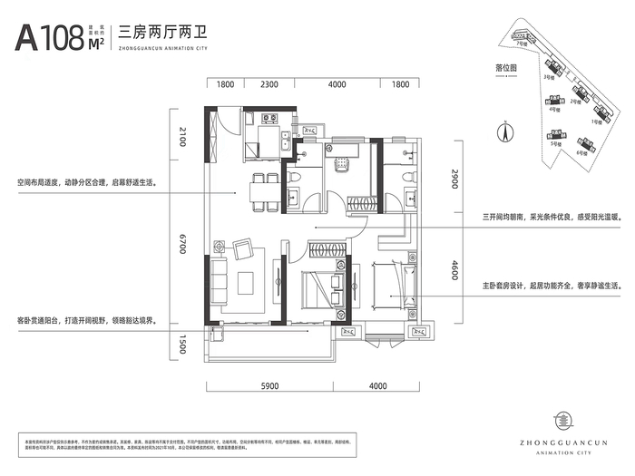 在户型设计方面,A户型是其主力户型之一,该户型为三居室、南北设计,三开间朝南,方正通透,动静分区,起居休憩互不打扰;餐客厅一体双厅连通,外接全景南向阳台;主卧带独立衣帽间,全明卫浴,享私密生活。U型餐厨动线,备餐、收纳井然有序,尽享美味食光。