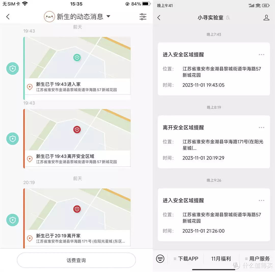 除了app推送的信息外,这款手表还支持微信提醒,绑定公众号,进入、离开各区域都会发信息给我们,非常贴心。