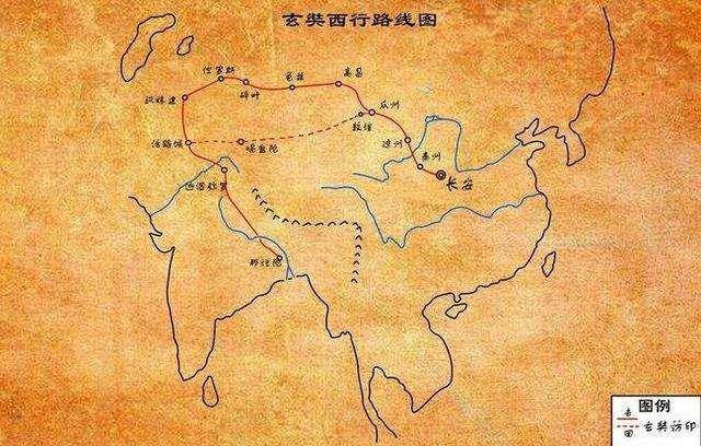 唐太宗贞观三年(公元629年),玄奘法师从长安出发经凉州出玉门关西行赴天竺,至贞观十九年(公元645年)返回,总共历时十七年,行程五万余里。其间经新疆吐鲁番、焉耆、库车,进入吉尔吉斯斯共和国,又经乌兹别克斯坦、塔吉克斯坦、阿富汗、巴基斯坦等国,最后才到达目的地印度,其间耗时约三年。
