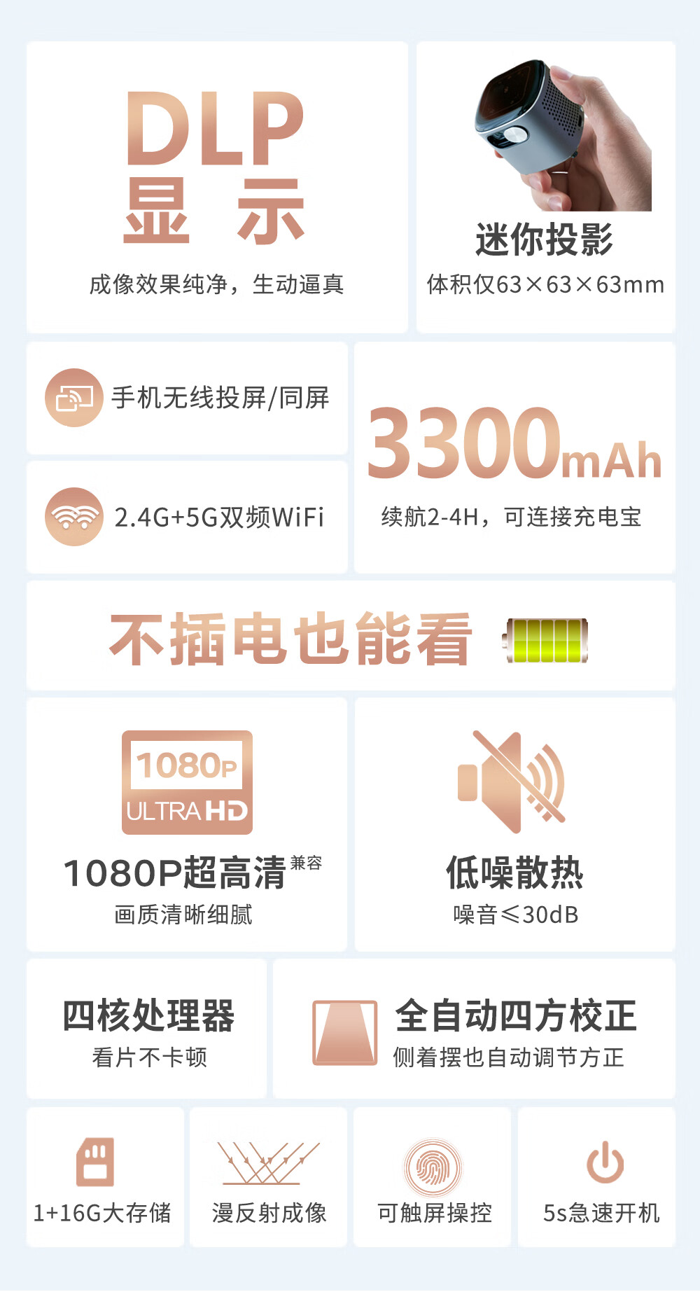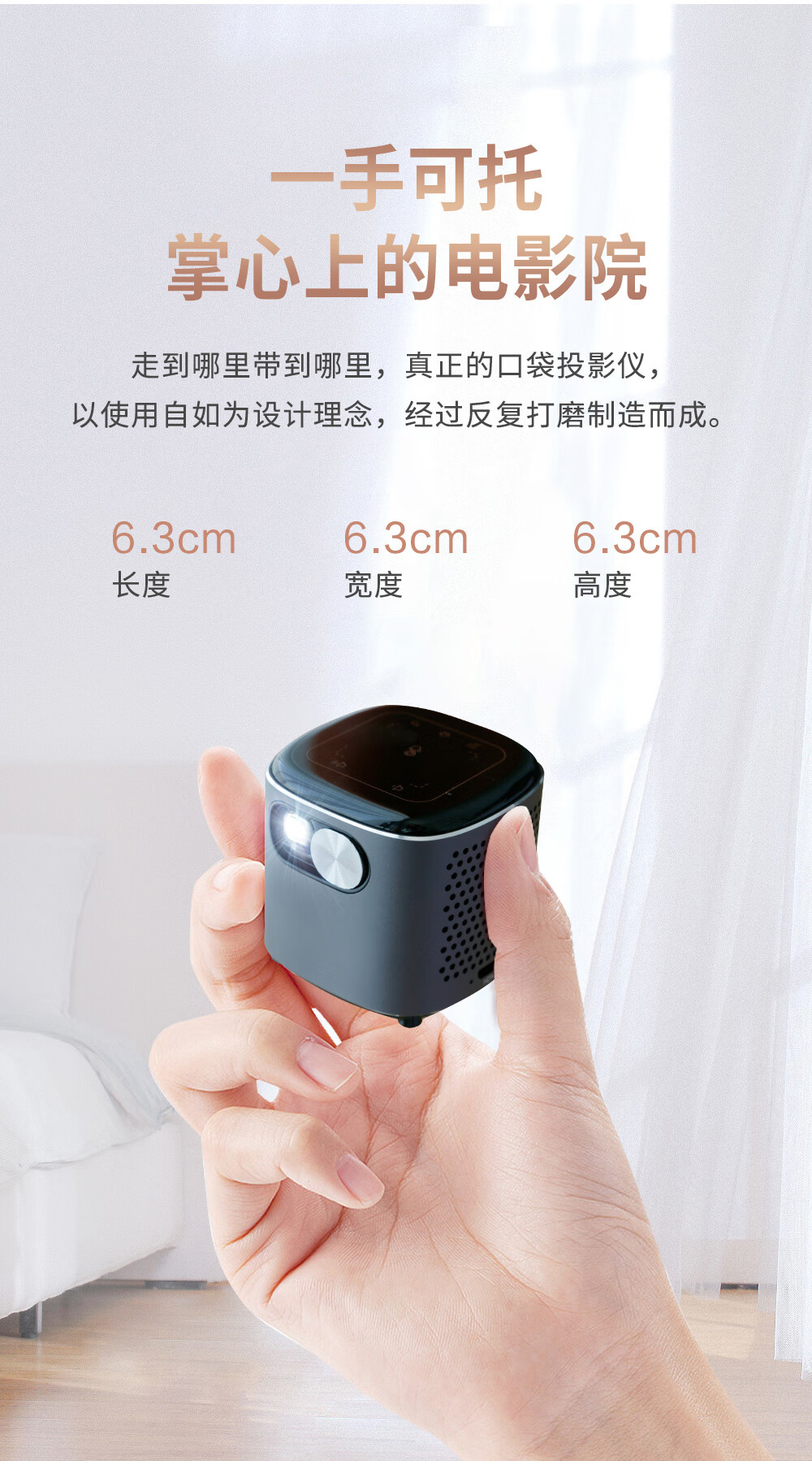 长宽高均仅为 6.3cm,真正的口袋投影仪,走到哪里带到哪里。顶部触控操作,无遥控也可用。搭载 HiFi 音响,一键切换蓝牙音箱模式。支持画面自动校正等特性。