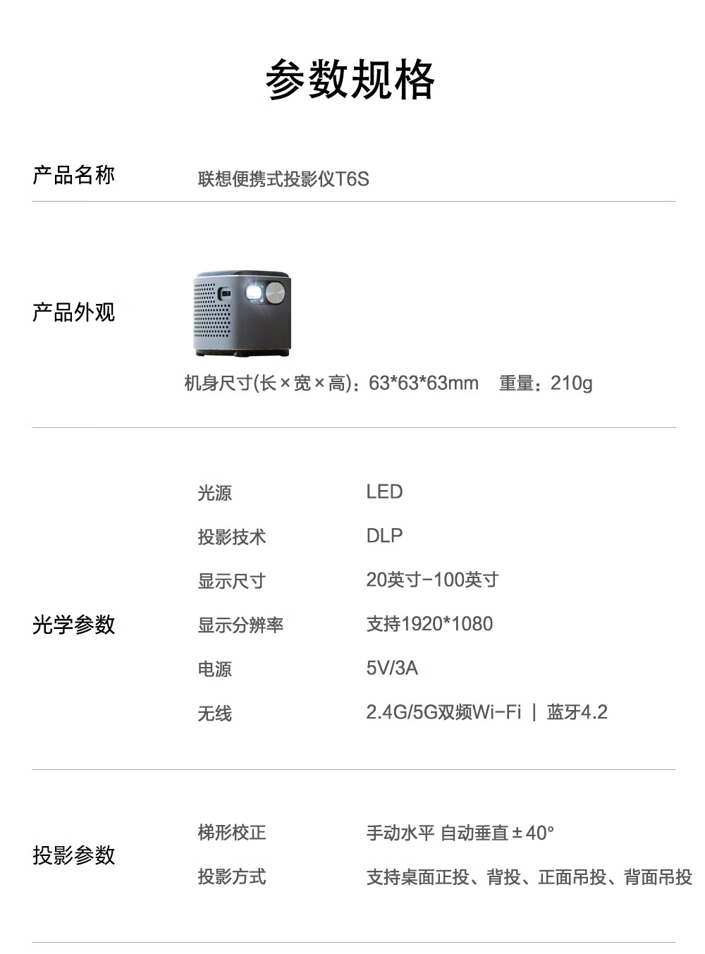 IT之家附联想 T6S 便携智能投影仪产品规格如下: