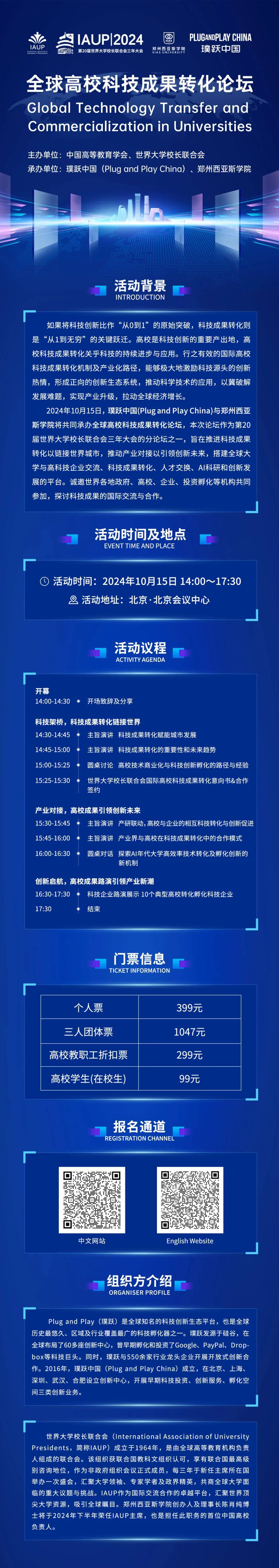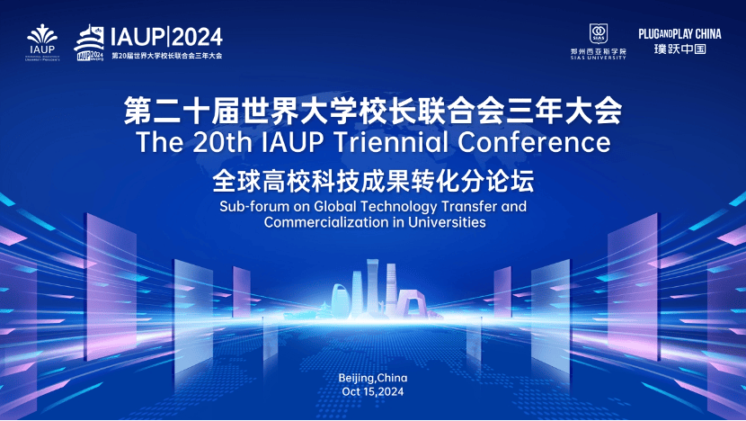 2024年10月15日,璞跃中国(PlugandPlayChina)与郑州西亚斯学院将共同承办全球高校科技成果转化论坛,本次论坛作为第20届世界大学校长联合会三年大会的分论坛之一,旨在推进科技成果转化以链接世界城市,推动产业对接以引领创新未来,搭建全球大学与高科技企业交流、科技成果转化、人才交换、AI科研和创新发展的平台。