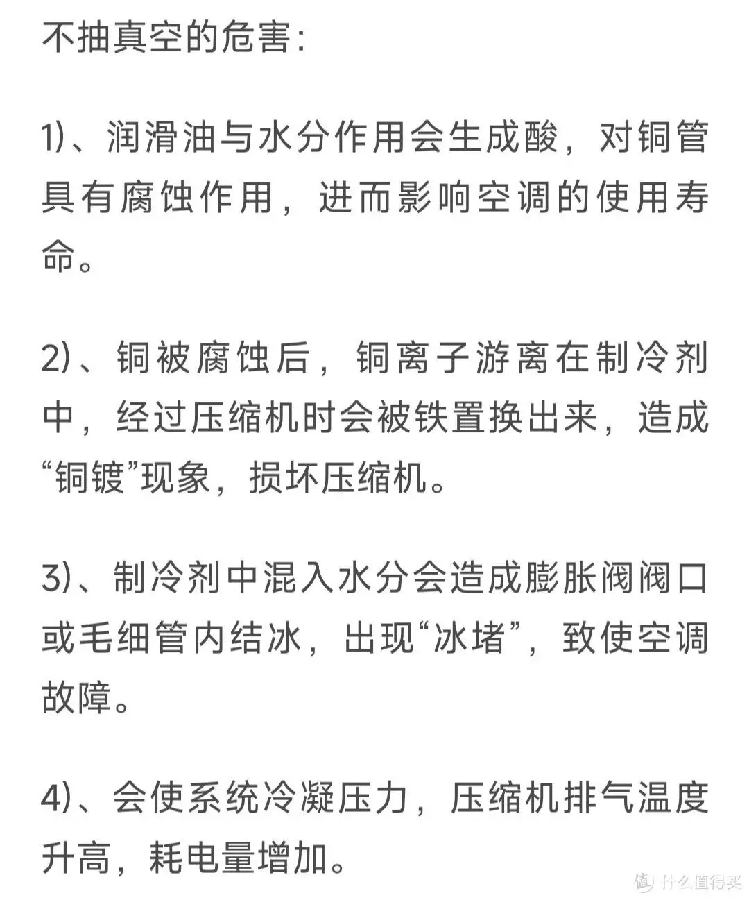 第七是安装的时候要交代师傅按规范,把管路抽真空抽够规范要求的时间,一般至少是十五分钟,毕竟一个空调保修都有六年,要用至少七八年,甚至有的品牌压缩机质保都有十年。所以如果抽真空这步省事不按规范办事,会影响制冷效率和机器寿命。