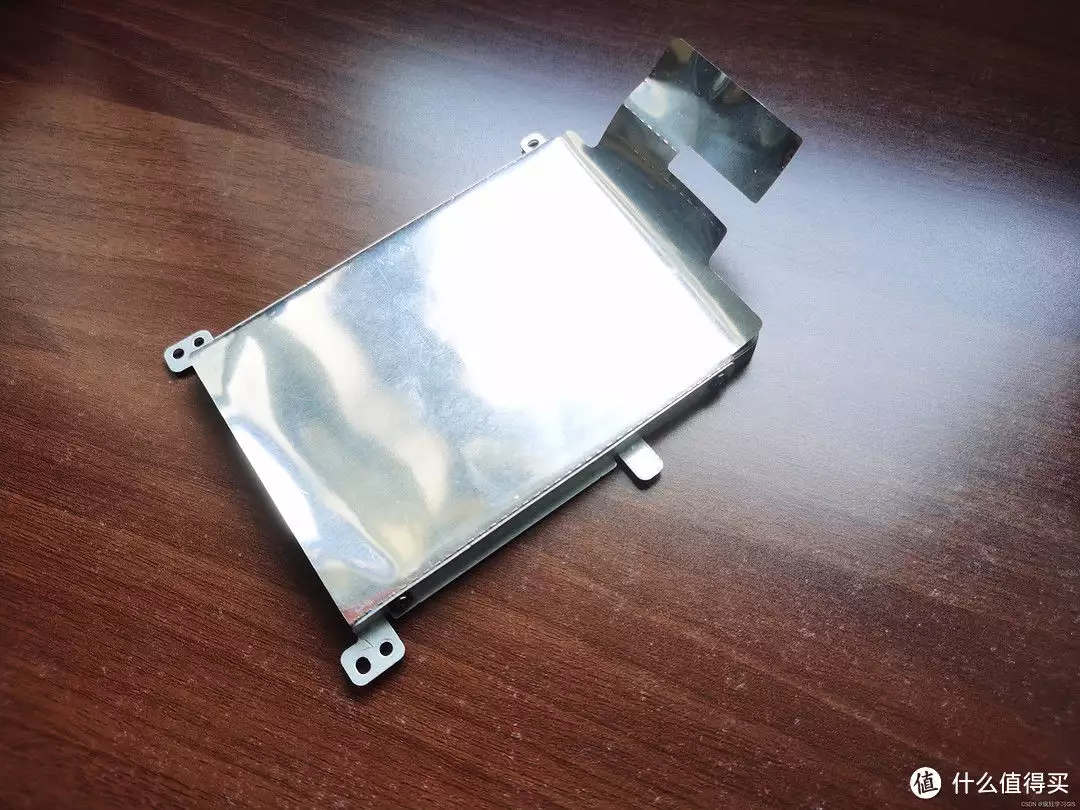 由于我这里是一个SATA接口的固态硬盘,这种接口的固态硬盘往往首先通过螺丝固定到一个硬盘支架上,随后硬盘支架再通过螺丝固定到电脑上。因此,本文需要首先将硬盘支架从电脑中取下来——依据硬盘支架上的螺丝型号,选取对应型号的螺丝刀加以操作,即可将硬盘支架取下来;其中,硬盘支架的其中一面如下图所示。