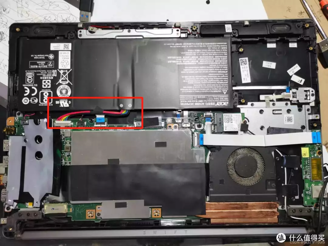 将底面的外壳去掉后,即可看到笔记本电脑的内部构造,如下图所示。其中,拆机后一定记得首先将笔记本电脑电池的排线拔掉,防止主板短路;如下图红色框内部分,即为我这里电脑的电池排线;大家在实际操作中,首先找到笔记本电脑的电池(电池一般体积都很大,且会有明显的字样标注,因此很好找),随后找到其周围与其相连的电线,即为电池的排线。这里需要注意,建议大家在拔掉电池排线前先拍一张照片,后期重新插上这条排线时就不会搞反正、负极(即插头的正、反)了。