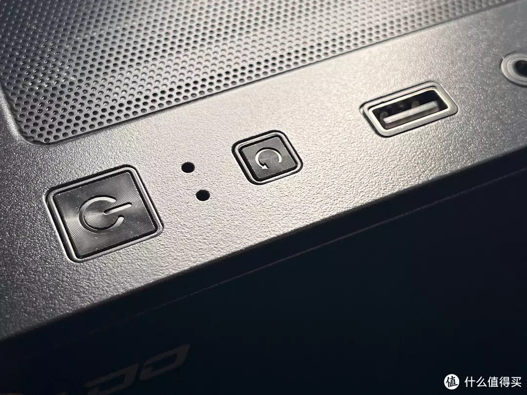 而机箱的顶部设计有金属网孔,能够有效提高散热效率,确保良好的通风性能,顶部由前至后依次是开关键重启键、usb2.0、耳机音响插孔、usb2.0、usb3.0,方便连接各种外设,满足用户数据传输的需求。另外最后面还有一个灯光调节的小按钮,方便用户调节光污染灯带