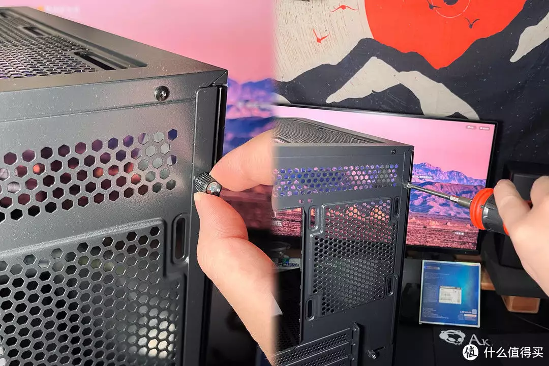 机箱左右侧面板的拆卸安装非常简单,仅需拧下螺丝即可,而如果不好拧时也可以借助工具螺丝刀