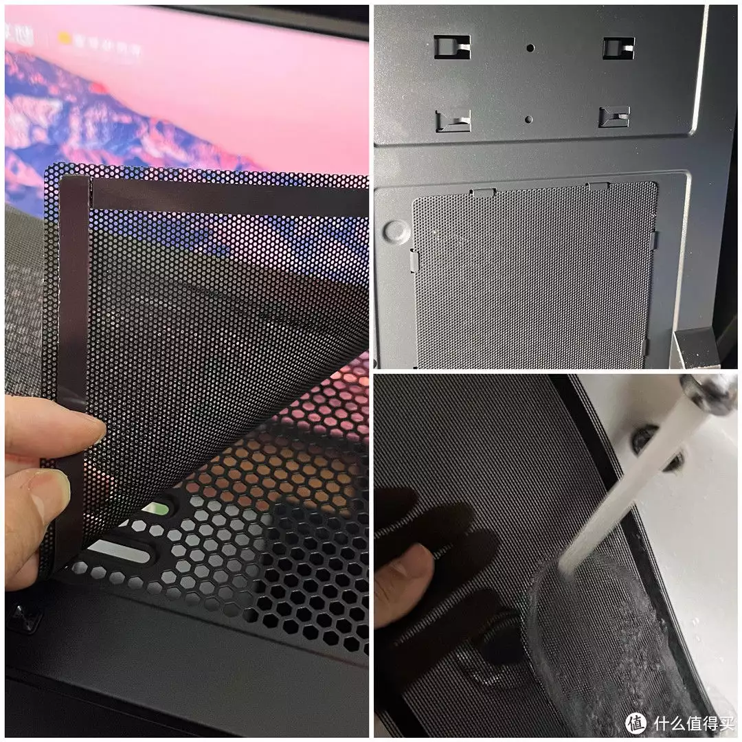 顶部的机箱金属网孔是磁吸设计、机箱底部电源处的网孔也是可以拆卸的,所以未来清理的时候将会异常的方便,仅需要摘下来用水冲洗即可,这真的是解决了一大痛点。