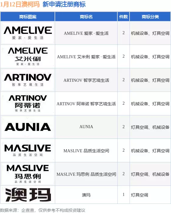 证券之星消息,根据企查查数据显示,近日澳柯玛股份有限公司新提交“AMELIVE 爱家 · 爱生活”、“澳玛”等15件商标注册申请。商标申请详情如下: