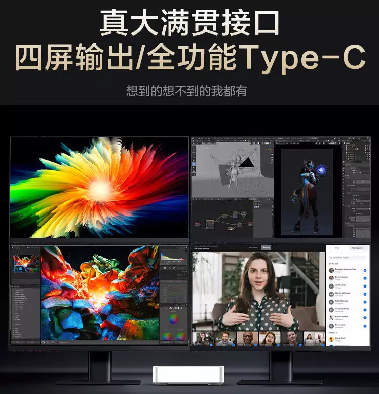 imini Pro830 暴风雪版主机还具备了一个 40Gbps 的 USB 4 接口,可用于连接高速雷电设备、接入 PD 电源、连接 8K 显示器,与 HDMI 2.1、DP 1.4 和全功能 USB Type-C 接口共同实现四屏同步输出。