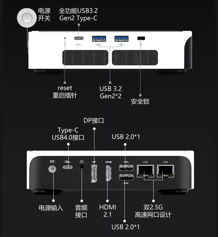 两个 USB 3.2 Gen2 Type-A 可实现 10Gbps 数据传输,两个 USB 2.0 接口专为连接键鼠设计;双 2.5Gbps 有线网口,可作为一台软路由使用,IT之家附接口图如下: