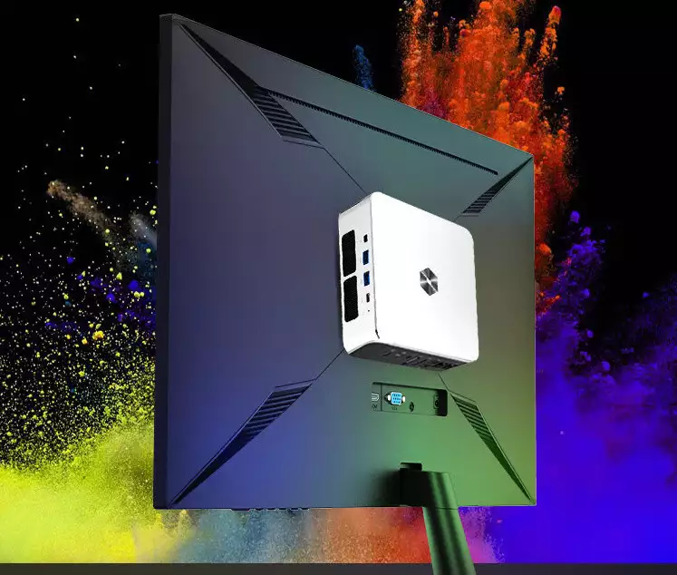 通过机身背面的 VESA 接口,imini Pro830 暴风雪版主机可以悬挂在显示器背部,在悬挂后开关按键位于更方便触碰到的顶部,侧置接口与后置接口方便用户连接设备。