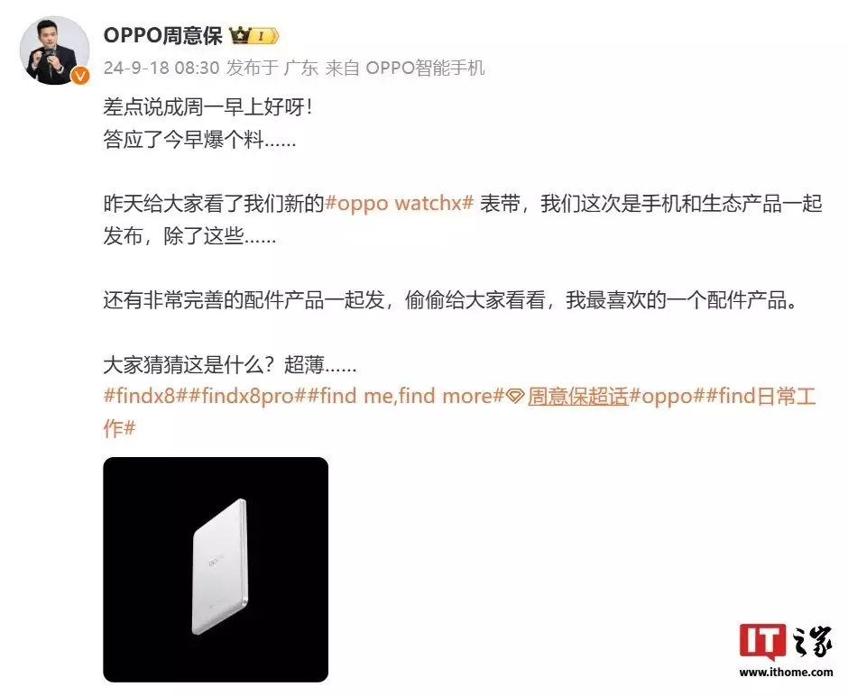 IT之家 9 月 18 日消息,OPPO Find 产品负责人周意保今日发文称“这次是手机和生态产品一起发布”,并透露了一款“超薄”配件新品。