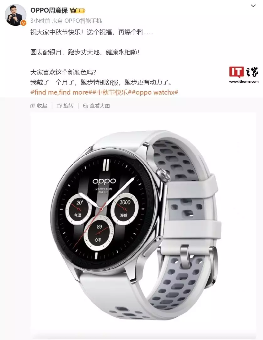IT之家此前报道,OPPO 全家桶预计将在 10 月“凑齐”,包括:OPPO Find X8 / X8 Pro 手机、OPPO Pad3 Pro 平板,以及 OPPO Enco X3 耳机。周意保昨日还透露了预计主打运动场景的 OPPO Watch X 智能手表白色表带款。