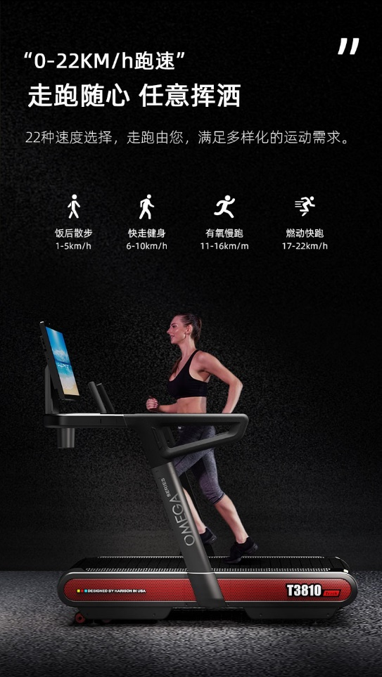 OMEGA T3810Track 跑步机可满足“0-22Km/h”区间内任意跑速,1-5 Km/h饭后散步模式、6-10Km/h快走健身模式,11-16 Km/h有氧慢跑模式,17-22 Km/h燃动快跑模式,22种速度选择,走跑随心,满足多样化运动需求。