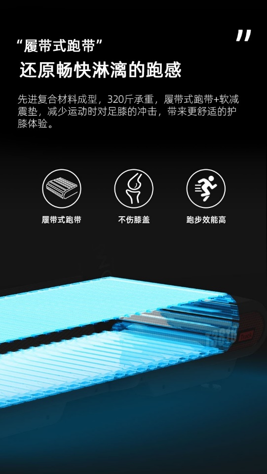 550mm宽大跑台,纵情驰骋:全面创新设计,让运动更加随心所欲。跑步面积高达1600×550mm,带来超感畅跑体验,钢构框架,加厚跑板,商用滚轴,为运动保驾护航。