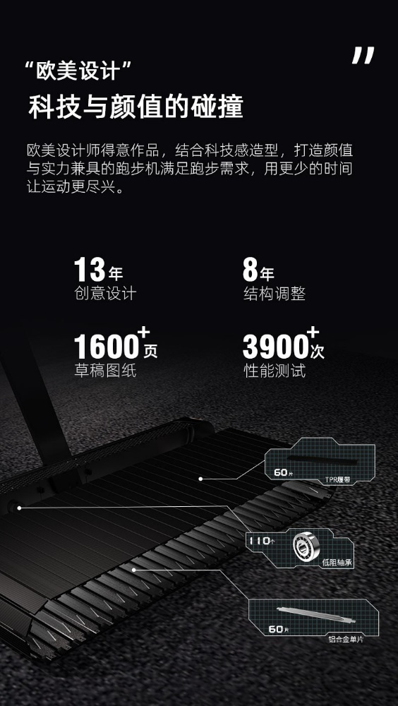 匠心独造 科技引领美国汉臣OMEGA T3810Track 跑步机是欧美设计师经过十三年的创意设计,长达八年结构调整打造的得意作品。1600+页草稿图纸,3900+次性能测试,利用60片TPR履带,110个低阻轴承,60片铝合金单片,打造出具有高科技感、集颜值与实力于一体的高端豪华版跑步机,可满足多种跑步健身需求,用最少的时间进行更酣畅淋漓的运动!
