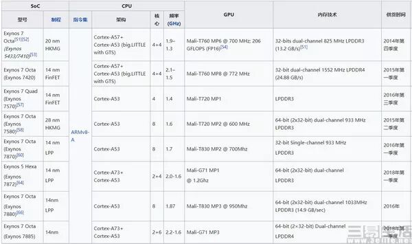 从万能的Wiki上,我们可以查到三星从2015年至今,推出的一系列中端Exynos7系列SoC。除了这次魅蓝S6上采用的7872以及刚刚才发布的7885之外,不难看出其他型号的规格都相当普通,不仅CPU只有四到八个A53小核心,频率也普遍不高,唯一的优势大概就是比同期高通和华为中低端更先进的制程(14nm)了——但是先进制程本身又会导致生产成本大幅上升……