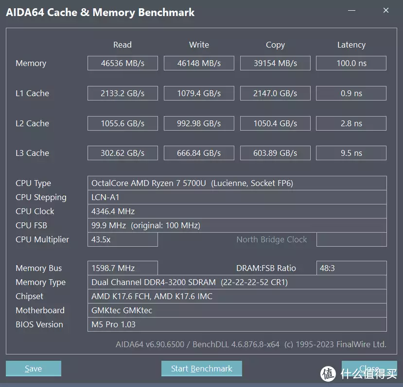 AIDA64查看DDR速率(读取)46536MB/S,DDR(写入)46148MB/S