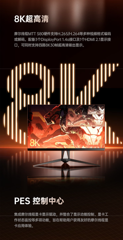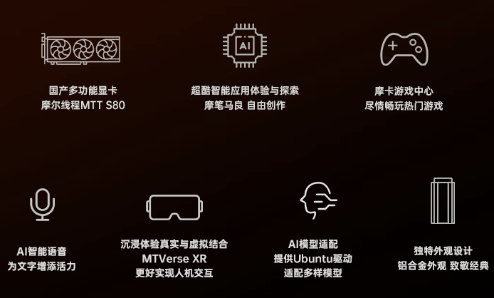 GPU 方面,“智娱摩方”游戏电脑采用了摩尔线程自家的 MTT S80 显卡,该显卡搭载 16GB GDDR6 显存、拥有 4096 个 MUSA 核心,运行频率为 1.8 GHz,可为用户提供 14.4 TFLOPs 的算力;带有 PCIe 5.0 x16 插槽,提供 128 GB / s 的带宽;同时配备 3 个 DP 1.4a 接口和一个 HDMI 2.1 接口。