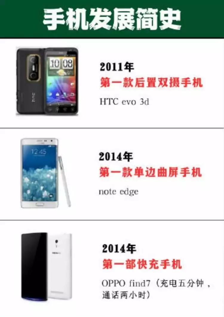 2011年,第一款后置双摄像头手机诞生;2014年第一款单边曲面屏手机诞生;2014年第一部快手手机诞生。