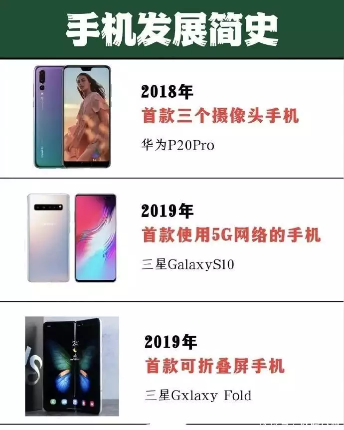 2018年,首款后置三摄手机诞生;2019年,首款使用5G网络的手机诞生;2019年,首款可折叠手机诞生。