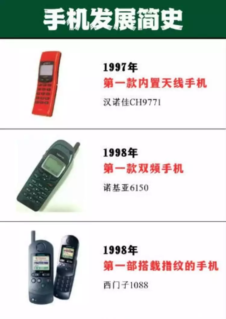1997年,第一款内置天线手机出现;1998年第一款双频手机;1998年第一部搭载指纹的是手机出现。
