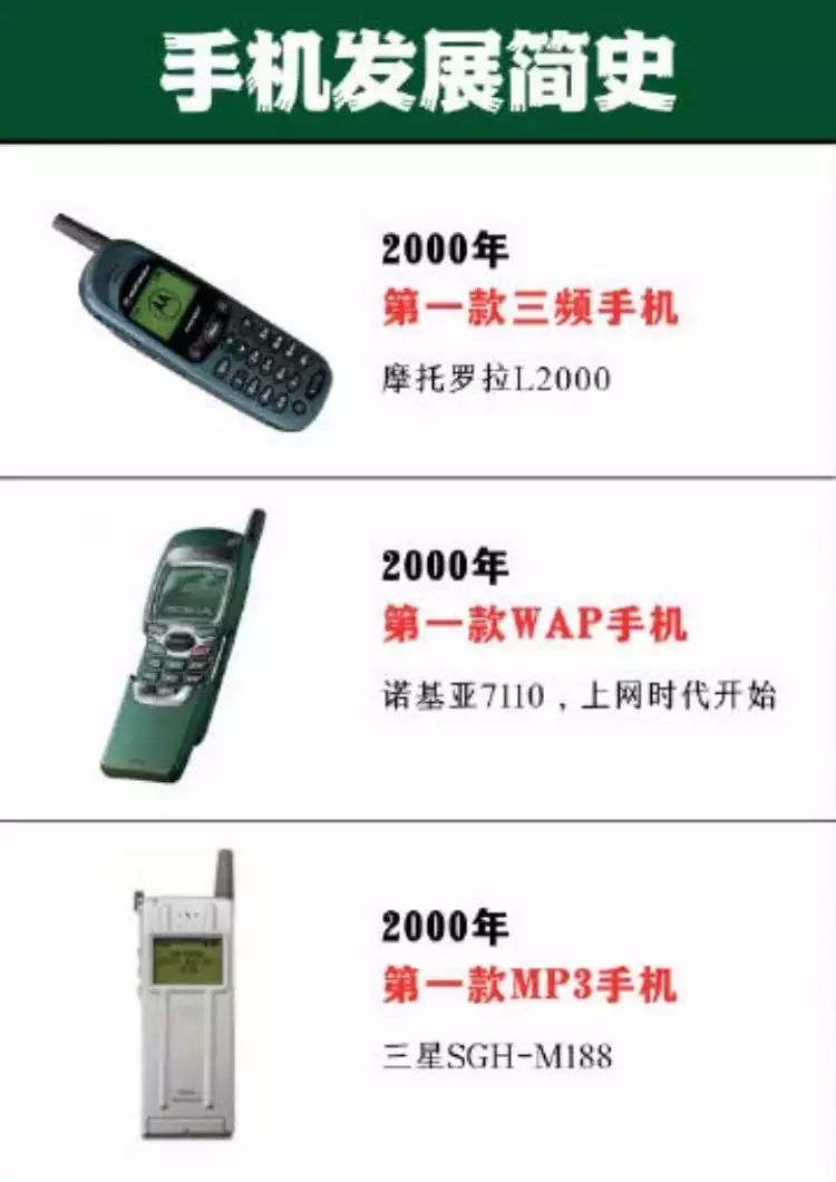 2000年,第一款三频手机诞生;2000年,第一款WAP手机诞生;2000年,第一款MP3手机诞生。