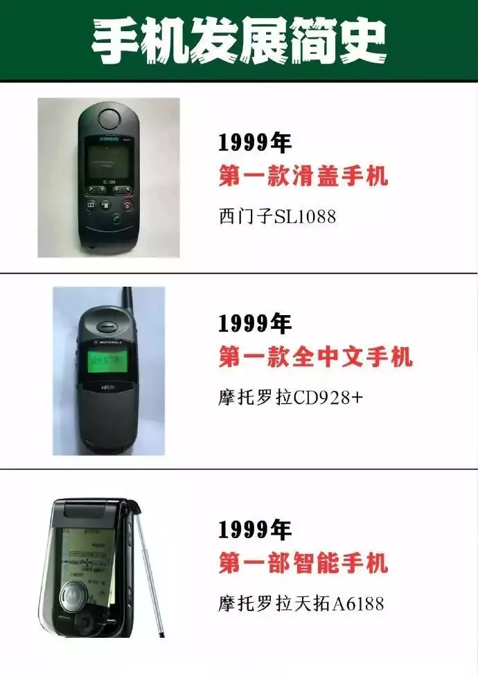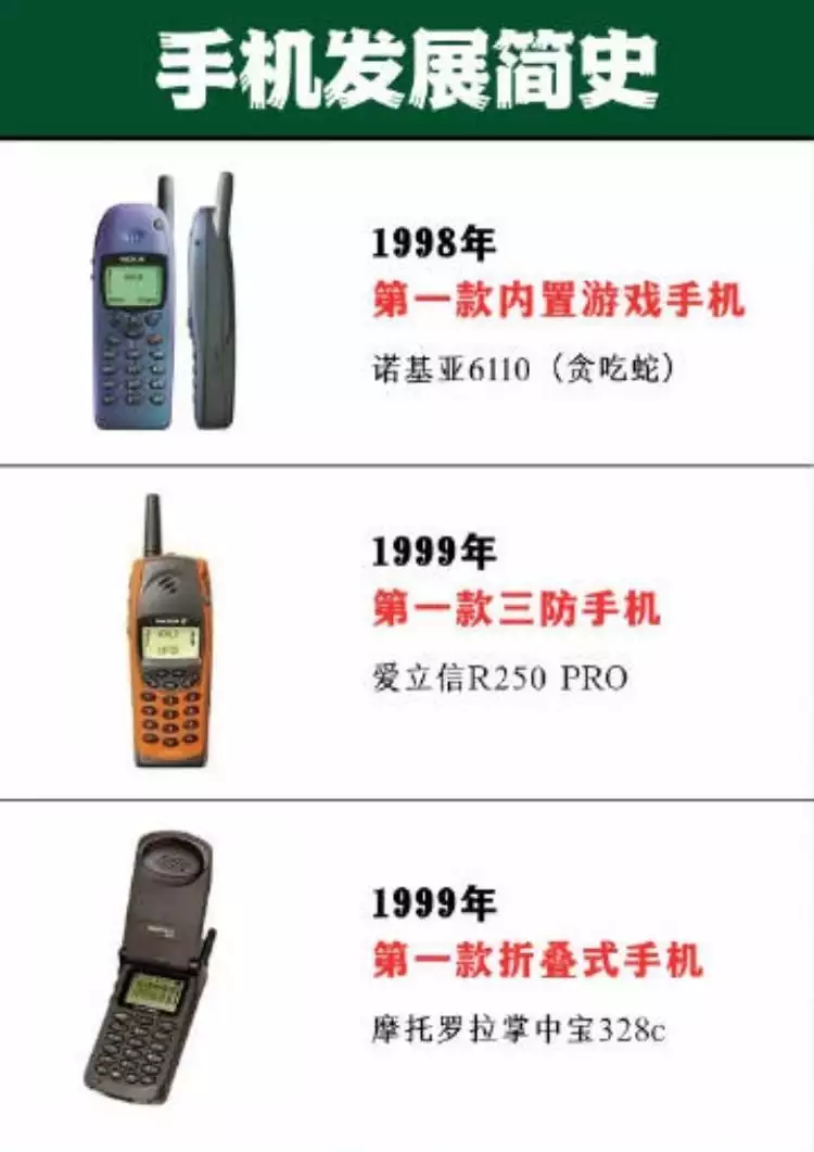 1998年,第一款内置游戏手机诞生;1999年,第一款三防手机诞生;1999年,第一款折叠屏手机诞生。