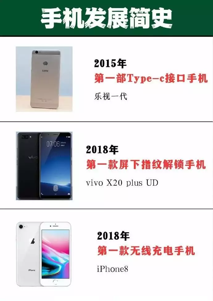 2015年,第一部type-c接口手机诞生;2018年,第一款屏下指纹解锁手机诞生;2018年第一款无线充电手机诞生。