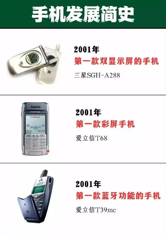 2001年,第一款双屏显示手机诞生;2001年第一款彩屏手机诞生;2001年第一款蓝牙功能的手机诞生。