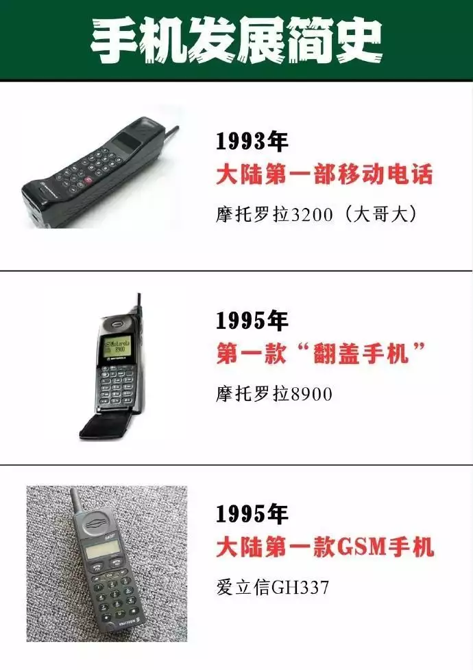 1993年,大陆第一部移动电话出现;1995年,第一款“翻盖手机”出现;1995年,大陆第一款GSM手机出现。