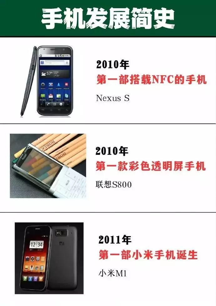 2010年,第一部搭载NFC手机诞生;2010年,第一款彩色透明屏幕手机诞生;2011年,小米第一部手机诞生。