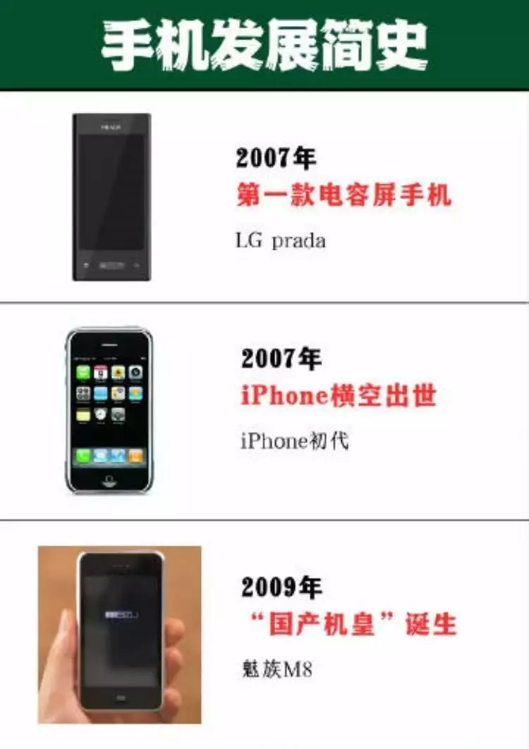 2007年,第一款电容屏手机诞生;2007年第一款iPhone手机诞生;2009年,魅族第一款手机诞生。